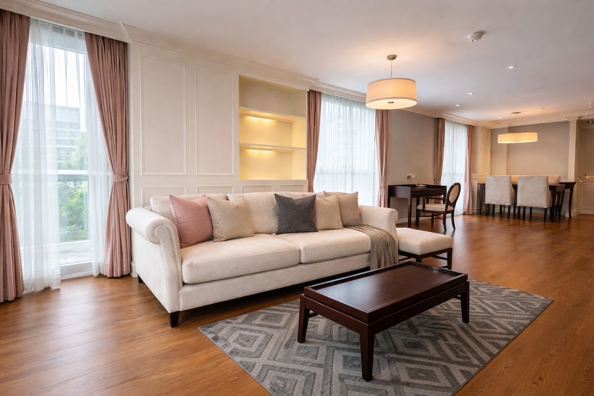 ★ MODERN LUXE SUITE GROUP STAY ★ CENTER OF EVERYTHING ★ • Access • Spacious living for 4-6 pp • 5-star hotel level beddings • 1 MIN TO PLOENCHIT BTS • 5 MIN TO CENTRAL EMBASSY/CHIDLOM • FAMOUS 4-FACE BUDDHA (1 BTS STOP) • SIAM SQUARE (2 BTS STOP) • ASOKE TERMINAL 21 (2 BTS STOPS) • EMQUARTIER (3 BTS STOPS) • THONGLOR (4 BTS STOPS) • SILOM (10 MIN BY TAXI/4 BTS STOPS) • King Power (5 BTS STOPS) • JJ MARKET (10 BTS STOPS) • NETFLIX • DAILY CLEANING • COMPLIMENTARY WATER & SNACKS