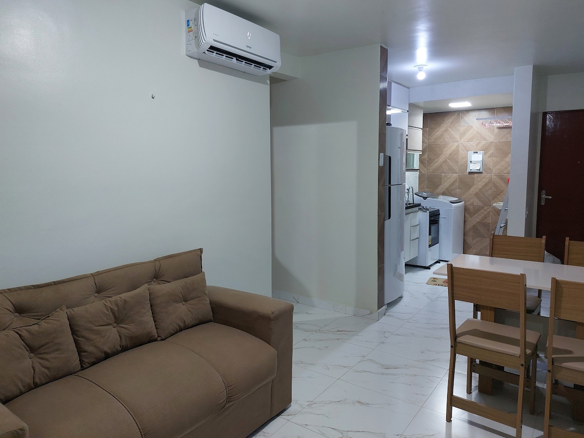 ¿Buscas un lugar tranquilo con buen alojamiento y una gran relación calidad-precio? Aquí tenemos un excelente espacio. Seguro, tranquilo, funcional, organizado, limpio, por no hablar de que todo está CLIMATIZADO. Cocina súper completa, equipada con nevera, congelador, airfryer, microondas, cocina con horno, batidora, todos los utensilios de cocina necesarios para hacer una deliciosa receta. Las habitaciones y la sala de estar cuentan con unidades de aire acondicionado, lo que hace que el clima sea aún más agradable.