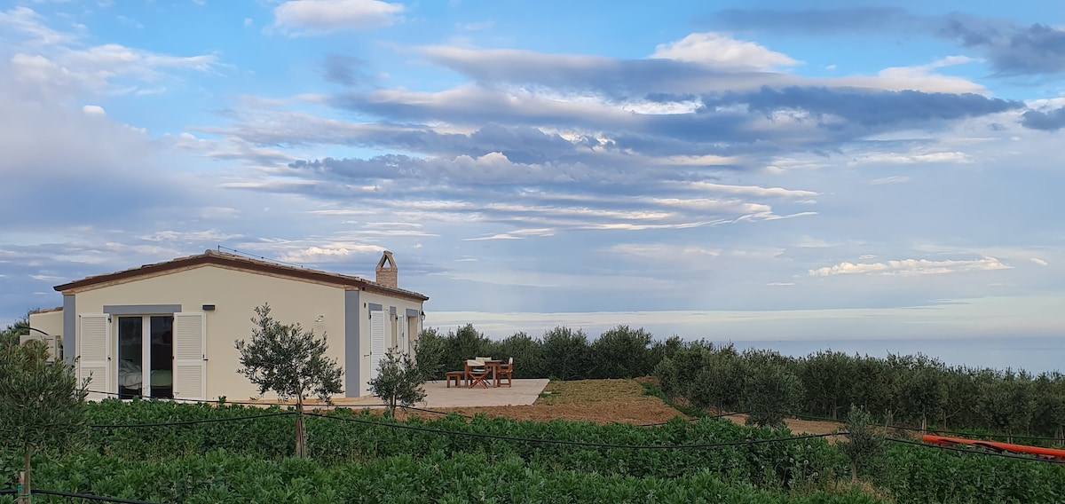 Relájate en este espacio tranquilo y elegante, con una vista increíble del mar, las colinas de Marche, las montañas, enclavado en un gran olivar. La cabaña es accesible y tiene 2 dormitorios: uno doble, uno con un sofá cama con un colchón de 16 cm que es extremadamente cómodo como una cama doble; dos baños, una sala de estar y una cocina equipada. Muebles antiguos y amueblados con buen gusto. Perfecto para largos períodos de trabajo inteligente.