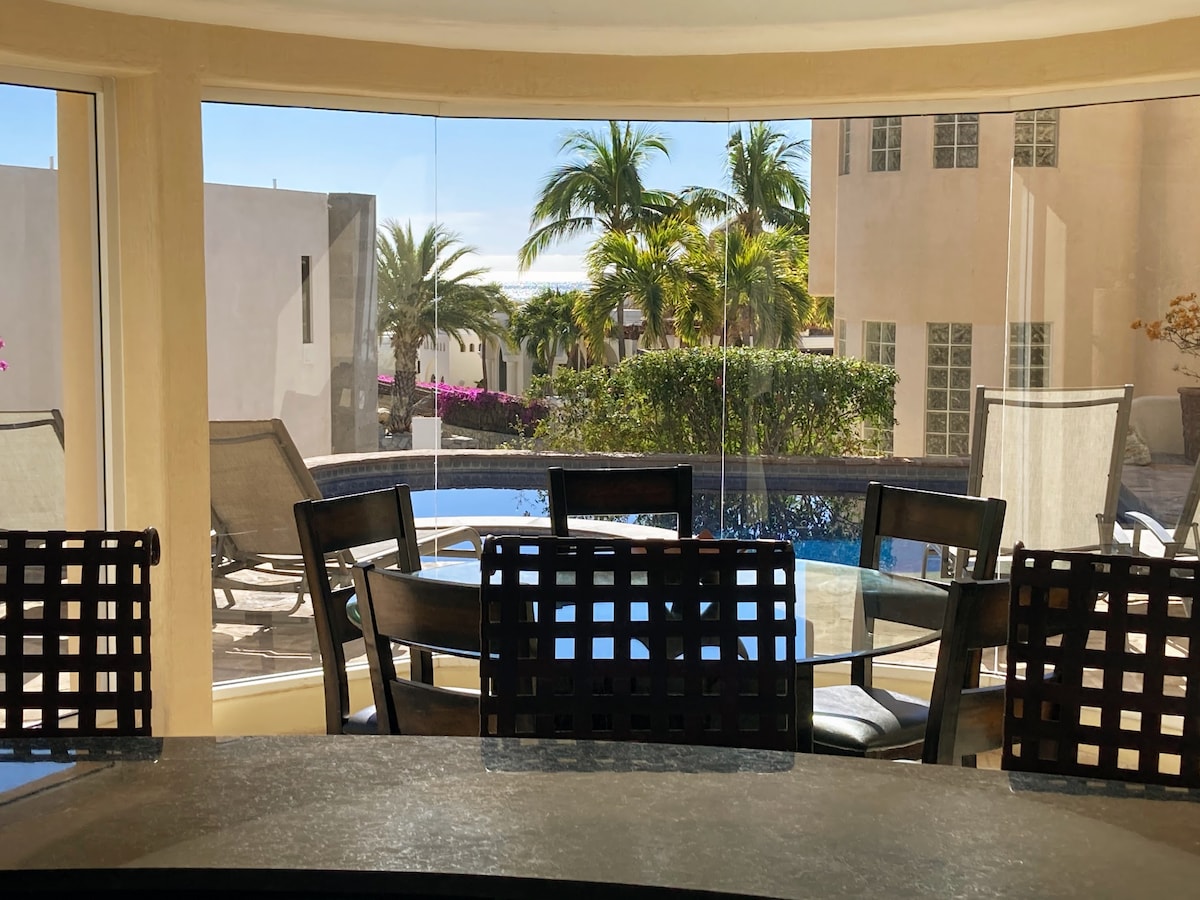 The condo's 180º view lets you enjoy sunrise and sunset at the Cabo Arch from your breakfast-dinner table! Terrace design offers intimacy and escape. Ideal for a romantic stay, home office with paradise views, BBQ dinners with sunset vistas, relaxing hammock siestas, whale-watching while cooking, and sunrise views from bed! Walking access to Cabo's top two beaches and next to The Cape and Thompson Hotel. Please remember, this is a rental condo, not a hotel, and the price reflects that.