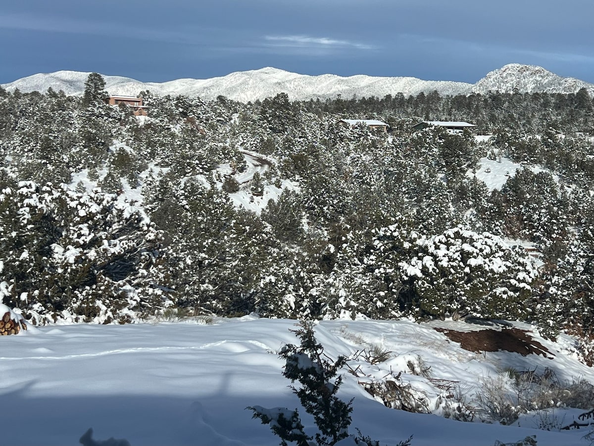 ¡Según las valoraciones, me eligieron como el anfitrión número 1 en todo NM! He puesto mucho amor en esta dulce y encantadora casita ubicada en el Camino Turquesa, una impresionante ruta escénica nacional. Ubicada en 10 acres privados con vistas a la montaña, estarás a 17 millas de Santa Fe, a 2 millas del encantador pueblo de Los Cerrillos y a 5 millas de la popular ciudad minera artística de Madrid. Puedes salir a caminar y disfrutar de una observación de estrellas fuera de este mundo, así como de increíbles amaneceres y atardeceres.