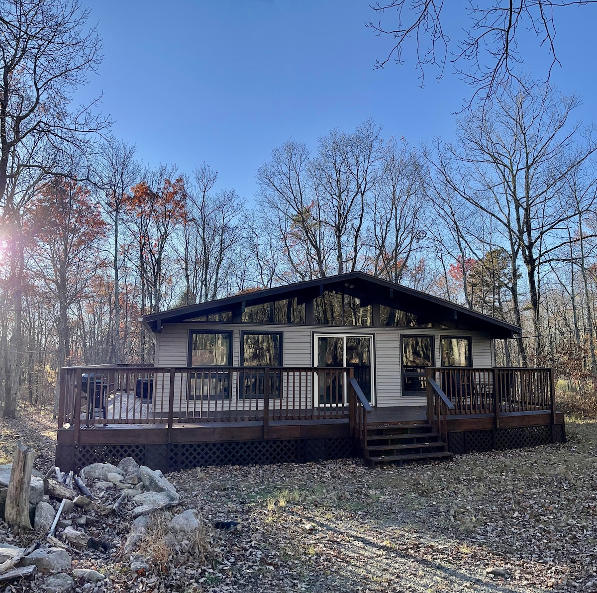 ¡Bienvenido a la mejor cabaña de las Pocono! La cabaña está bien cuidada y actualizada con buen gusto, ubicada en un gran y tranquilo terreno arbolado. Excelente ubicación con muchas atracciones cerca: lagos, playas, estaciones de esquí (Jack Frost, Big Boulder, Blue Mountain), golf, senderismo, rafting en aguas bravas, ciclismo, el centro de Jim Thorpe, paintball, parques acuáticos cubiertos y mucho más. La cabaña cuenta con una sala de juegos, cocina totalmente equipada, gran patio trasero privado con un jardín zen japonés, parrilla de gas y un pozo de fuego.
