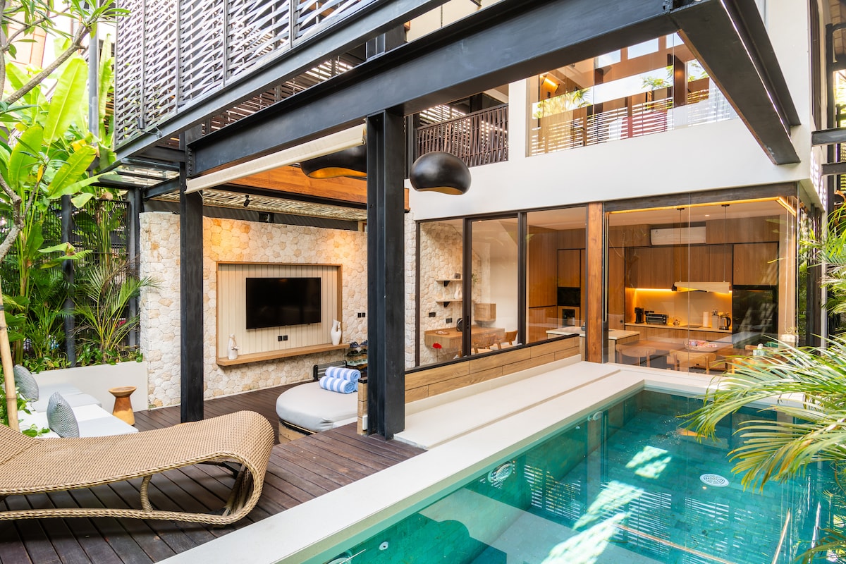 Enjoy your romantic private times in a luxurious complex, close to a fine selection of world-class cafes, restaurants and beach clubs. But perfectly hidden in a serene and quiet villa neighbourhood. This villa features an ensuite bathtub and offers a perfect dip-in pool. Enjoy your floating breakfast under the wood panels with sunlight gently pouring through. Chillax on the bean bag or sun loungers at your choice while soaking up the view of the garden.