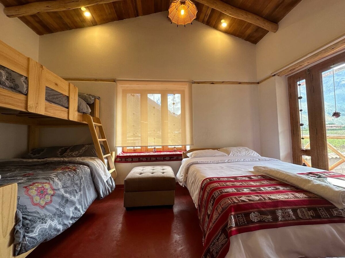 Casa ecológica nueva, amplia e iluminada. Localizada en el corazón del Valle Sagrado, a 5 min del centro de Urubamba y 20 min de Ollanta. Rodeada de montañas y con un riachuelo que pasa dentro de la propiedad. Cama King size, espacio para yoga o trabajo, balcón y agua caliente solar en cocina, baño y ducha. Ideal para reconectar con la naturaleza sin renunciar al confort. Hecha con amor, pensada para tu bienestar. ¡Te esperamos!