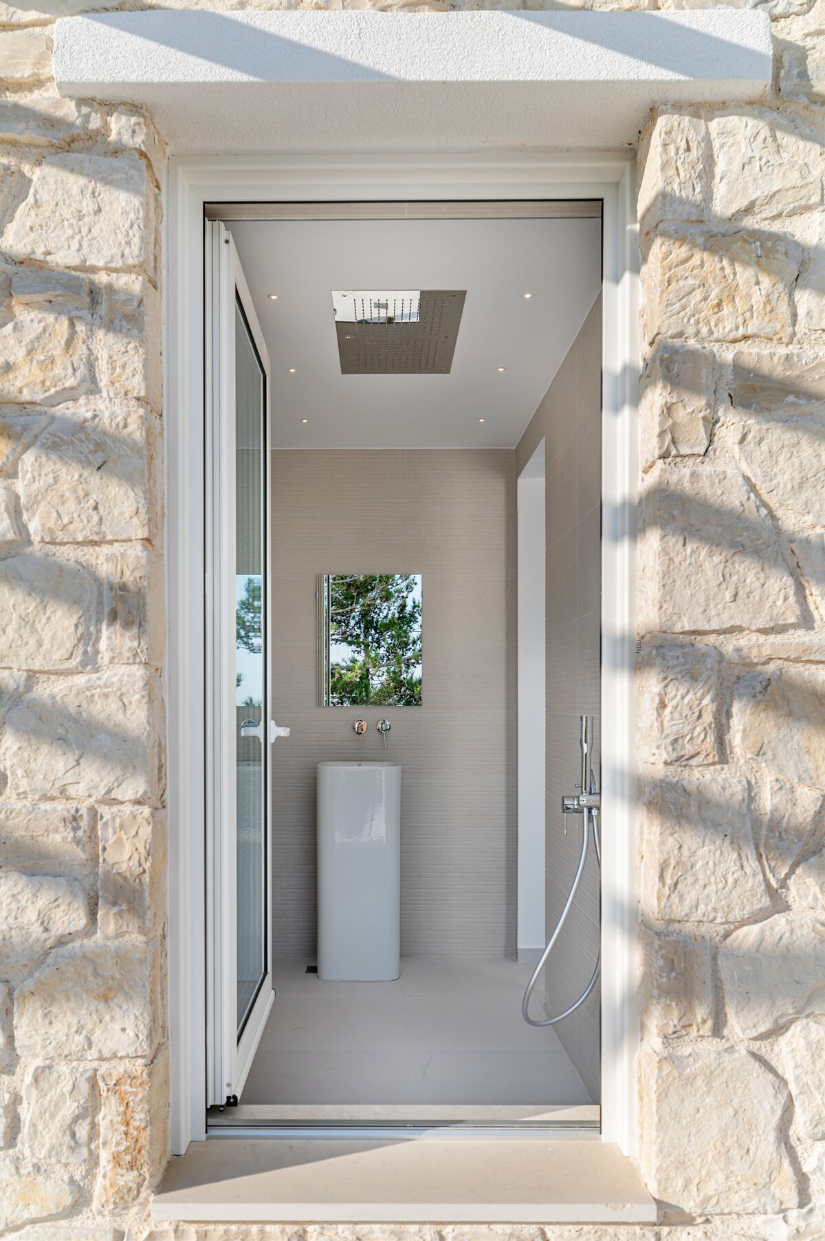 ¡Bienvenido a la villa de tus sueños, construida en contacto con una formación rocosa! Esta residencia ofrece dos dormitorios con baño privado en suite. (1 con sofá cama adicional) La villa está situada en una parcela de 6000 m2 llena de pinos y olivares. Varios escalones conducen a tu playa aislada. La cocina y el comedor en el aithrio cuentan con vistas panorámicas al mar. Los espacios al aire libre de 120 m2 incluyen una sala de estar protegida por una pérgola de sombra, tumbonas, un lugar de comedor al aire libre, parrilla, ducha