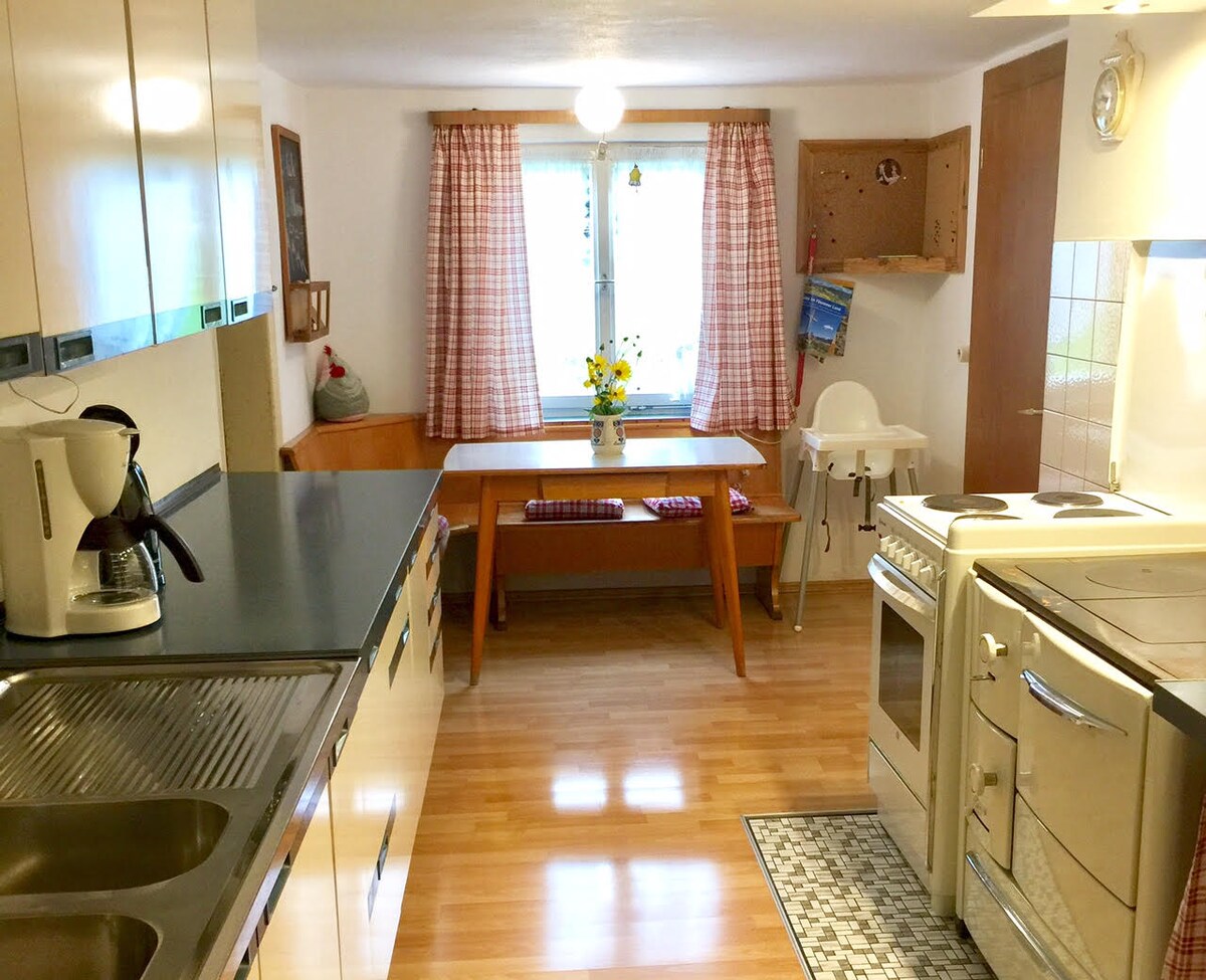 El apartamento vacacional está situado en nuestra casa, en la planta baja, y es perfecto para grupos entusiastas de la montaña y la naturaleza y para pasar noches acogedoras. Nuestro apartamento forma parte de una granja de montaña de 300 años de antigüedad, que se encuentra en medio de prados de montaña a una altitud de 1450 m. La ubicación óptima en una ladera sur soleada garantiza horas maravillosas en una terraza con vistas de 360°. En el renovado y espacioso apartamento (120 m2) encontrarás una mezcla única de encanto antiguo y comodidad moderna.