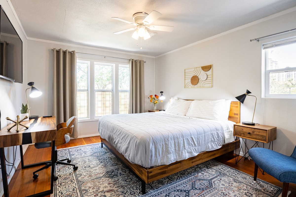 Disfruta de una buena noche de descanso en una cómoda cama tamaño king y de fácil acceso a todo desde este alojamiento perfectamente ubicado a pocas manzanas del centro de Phoenix. Este espacio bien diseñado es funcional y cómodo, tanto si vienes para el próximo partido de fin de semana como si estableces un hogar acogedor lejos de casa durante un viaje prolongado por trabajo o estudios. Cuenta con aparcamiento gratuito en la calle, a poca distancia a pie, en bicicleta o en patinete del centro de la ciudad y con todas las comodidades de un hogar.