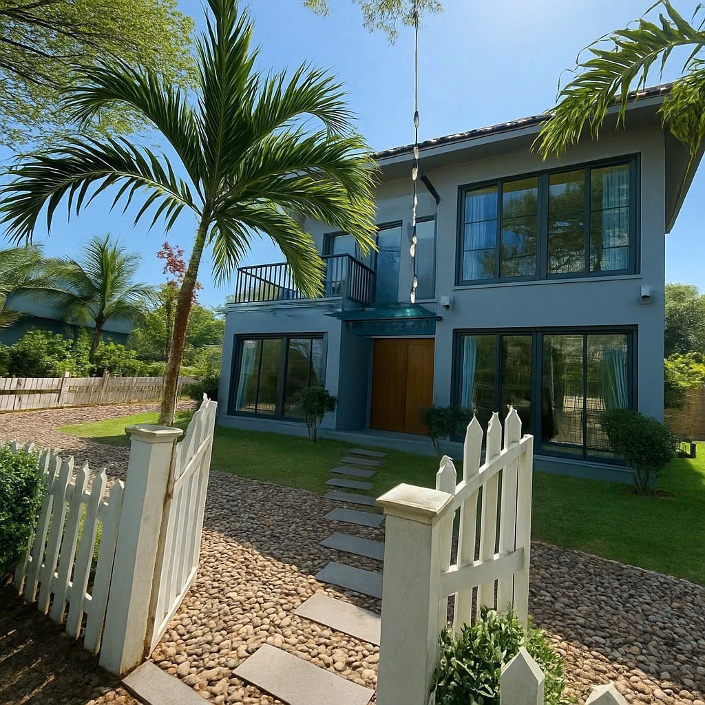 Lee Villa features elegant European-style architecture with an open layout, surrounded by lush greenery and colorful flowers. The front includes a salt-treated swimming pool and a private garage for easy car access. Inside, you’ll find a stylish living room, a fully equipped kitchen and bar, and a bright central area lit by a skylight. The villa offers 2 double bedrooms and 1 twin room. it’s perfect for families, friends, or professionals seeking a quiet and refreshing retreat.
