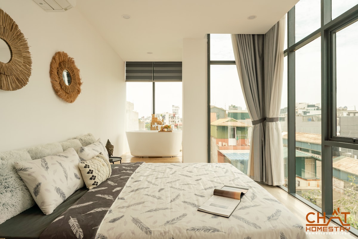 Esta es una casa ubicada justo en el corazón del casco antiguo de Hanoi, diseñada en un estilo bohemio con luz natural. Tendrás un espacio lleno de vegetación y un amplio balcón con vistas a nuestro jardín tropical. Tu comodidad es nuestra máxima prioridad. Puedes hacer uso de toda la casa, incluida la habitación, la cocina, la sala de estar, la pequeña zona de jardín y el espacio de lavandería. Queremos que te sientas como si estuvieras en tu propio hogar.