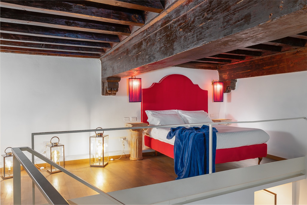 The Loft is located inside a Florentine palace in Via dei Cimatori, some steps from the Duomo, Piazza della Signoria and inside Florence’s historic center. Original stone walls and wooden beam ceilings and a glass bridge create an authentic mix of modern and Renaissance atmosphere, enhanced by renovation in March 25 with parquet flooring and a warm and vibrant bathroom. The New private balcony offers seating and a glimpse of the upper section of the Cathedral’s Duomo Santa Maria del Fiore.