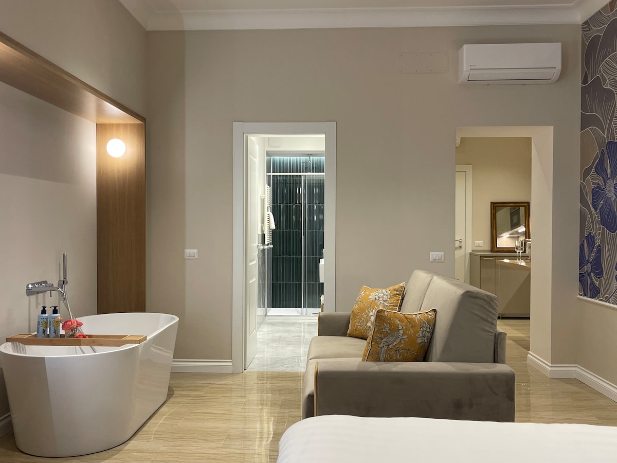 Luminoso apartamento situado en la 5ª planta de un edificio de principios del siglo XX con vistas al acueducto de Nerón, distribuido en 3 ambientes: una romántica y espaciosa habitación doble con cabina de ducha a la vista; un amplio cuarto de baño con acabados de travertino, dotado de lavabo doble, inodoro y bañera de hidromasaje; y una sala de estar con cocina americana y un cómodo sofá que se convierte en una verdadera cama doble.