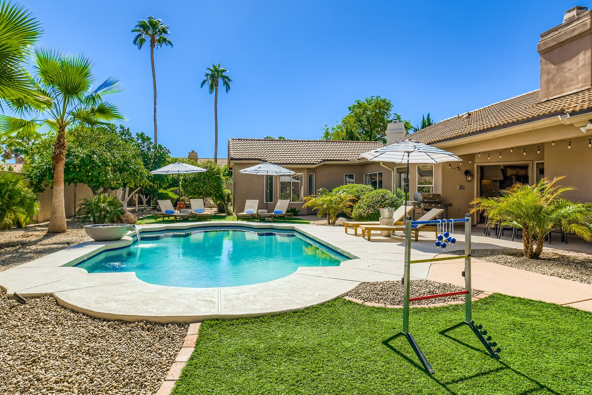 Lujosa villa de 4 dormitorios ubicada en el campo de golf Legacy con piscina climatizada en el patio trasero y bañera de hidromasaje. La casa tiene camas tamaño king en 3 dormitorios, una cama tamaño queen y un sofá cama tamaño queen en el loft y un sofá cama tamaño queen en la sala de estar. Amplia suite principal y baño en el nivel principal. La casa ofrece otras comodidades; wifi, TV por cable, aire acondicionado, una cocina totalmente equipada, un bar comedor al aire libre patio y parrilla. A 15 minutos de Sky Harbor, a 30 minutos del aeropuerto de Phoenix Mesa; a 20 minutos de Phoenix Suns y el estadio Diamondback.