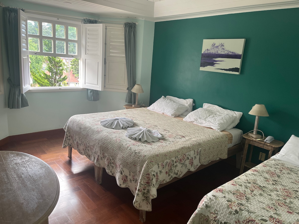 Suíte privativa com 1 cama de casal e 1 cama de solteiro, banheiro privativo, vista panorâmica e sacada.