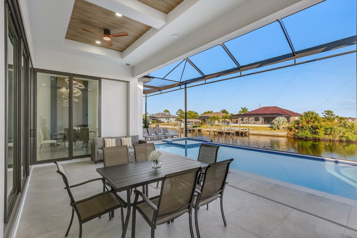 Villa510 es un refugio frente al agua de nueva construcción ideal para estancias prolongadas en Cape Coral. Disfruta de las tranquilas vistas al agua del canal de sal y los manatíes desde el lanai, luego relájate en tu piscina privada climatizada y spa, perfecto durante todo el año. La cocina al aire libre y el lanai crean una rutina diaria fácil y cómoda. El interior ofrece tres dormitorios privados en suite, un estudio con cama de aire opcional, sala de estar abierta y televisores en todas las habitaciones. Cerca de tiendas, restaurantes y playas, perfecto para los amantes de la nieve que buscan comodidad y facilidad.