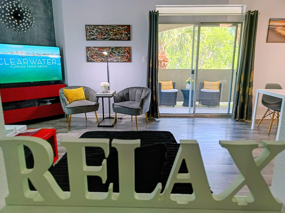 ¡Condominio moderno, luminoso y colorido ACTUALIZADO con PISCINA CLIMATIZADA GRATIS! Primer piso SIN escaleras. A 2 millas de la playa. Wifi RÁPIDO Y loco, ¡a 600 mbps! Excelente ubicación céntrica cerca de 2 centros comerciales, restaurantes, parques y muchas playas locales de la costa del golfo. La comunidad tranquila y SEGURA tiene una piscina climatizada, gimnasio, canchas de tenis y parrillas de gas para que las disfrutes. ¡Solo trae tu manta de playa y traje de baño y RELÁJATE! ¡A poca distancia a pie de tantas tiendas/restaurantes y el sendero Pinellas!