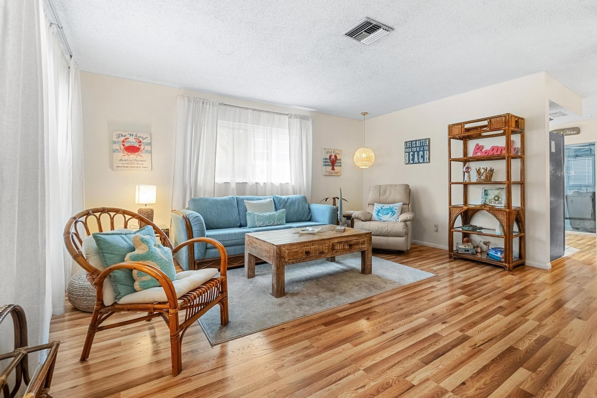Relájate y recarga energías en una elegante escapada tropical de mediados de siglo, ¡a pocos minutos de la playa! 2BR/2BA con un dormitorio adicional en la habitación de Florida con capacidad para 8 personas. Ubicado en un barrio tranquilo a pocos minutos de Indian Rocks y Clearwater Beach, con excelentes restaurantes y tiendas. Disfruta de un patio trasero privado vallado y una zona de barbacoa. Perfecto para familias o grupos que buscan comodidad y conveniencia. ¡Se admiten mascotas! Un perro bien educado es bienvenido (se aplica una tarifa adicional de $225 por mascota). Lo siento, no se admiten gatos.