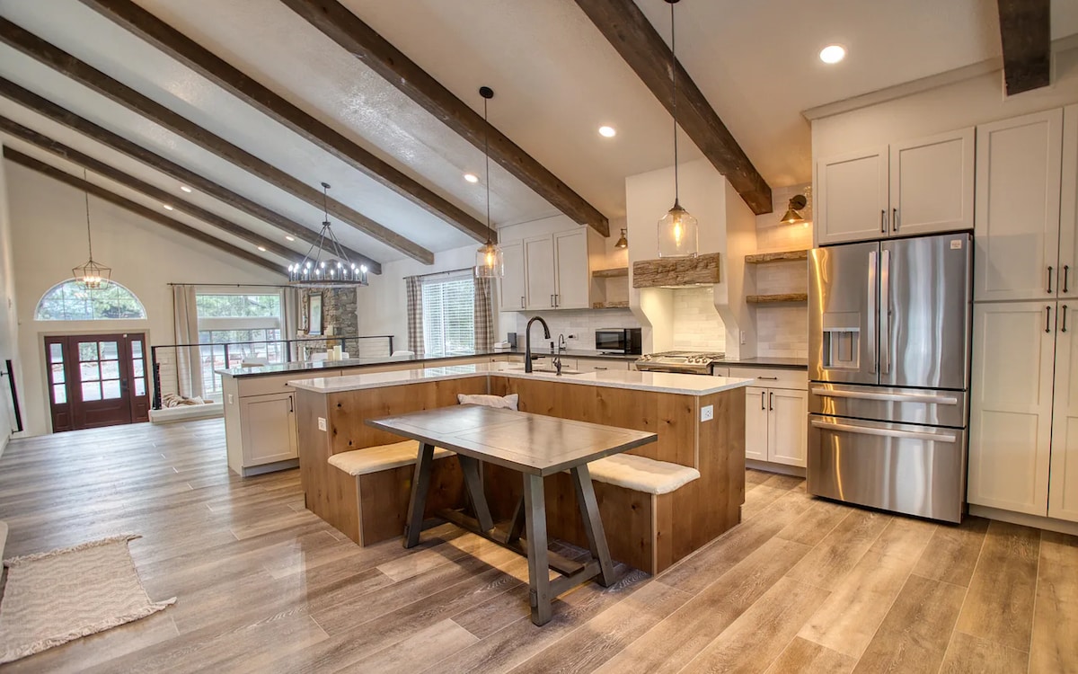 Despiértate con el canto de los pájaros en un arroyo bordeado de pinos que alimenta el lago oculto de Lakeside. Rema en los kayaks incluidos, pasea seis minutos hasta el puerto deportivo y la parrilla, luego brinda con malvaviscos al atardecer alrededor de la fogata. Interior: sillón de masaje de cuerpo completo, televisor inteligente de 75 pulgadas, juegos de mesa y PlayStation. Cuatro amplios dormitorios y tres baños duermen diez en sábanas frescas. Cocina de chef, espacio de trabajo, Wi-Fi, aire acondicionado y estacionamiento. Un perro preaprobado (tarifa adicional) si simplemente no puedes viajar sin ellos, de lo contrario, un refugio libre de mascotas. Senderos cercanos.