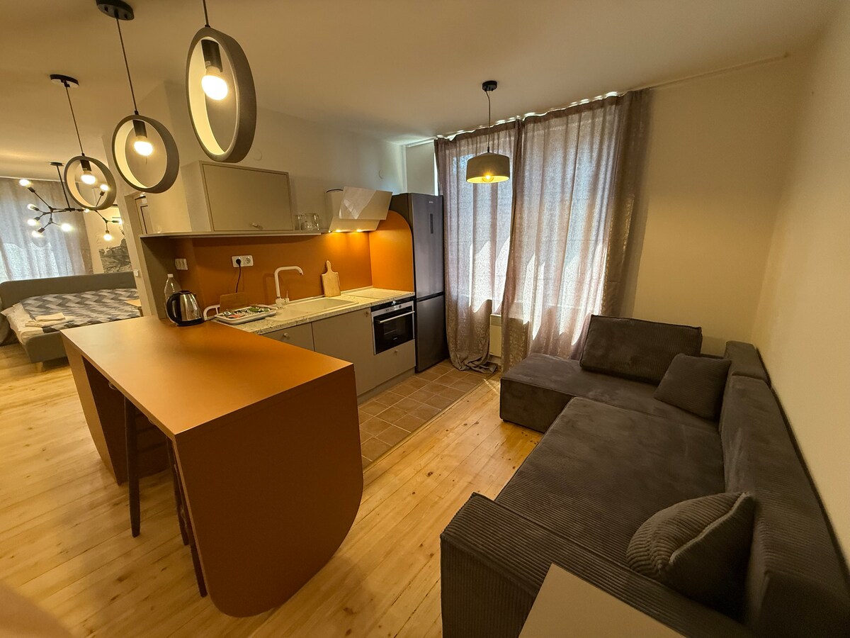 **Actualización de abril de 2024** Nuevo Internet de fibra óptica instalado + nueva conexión 5G ultra ilimitada como respaldo. Bienvenido a nuestro acogedor apartamento de 1 dormitorio ubicado a solo 100 metros de la carretera de esquí y el bosque. Nuestro apartamento cuenta con una cocina completa, baño, un cómodo sofá cama en la sala de estar, lo que lo hace perfecto para parejas o familias pequeñas. Con acceso al gimnasio y chimenea común. ¡Los restaurantes y bares están a poca distancia en invierno o a 20 minutos caminando del casco antiguo en verano!
