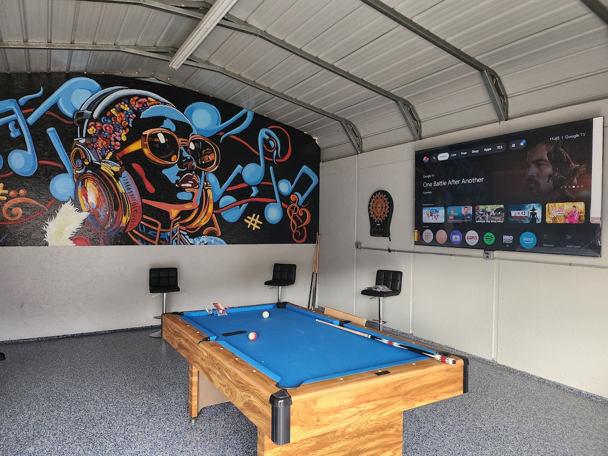 Pittsburgh retreat sleeps up to 8 with couch and floor mattresses for kids. The Queen bedroom includes permanent crib with sheets. 2 bedrooms — king and queen. Fully fenced backyard with large fire pit and creek access. Free parking for 6 vehicles. 20-30 min from Acrisure Stadium, airports, and turnpike. Basement suite with pool table, kitchenette, and full bath. Kid, pet, and creek friendly — baby gear included, strollers, high chair eating utensils/dishes. Perfect for families and small groups