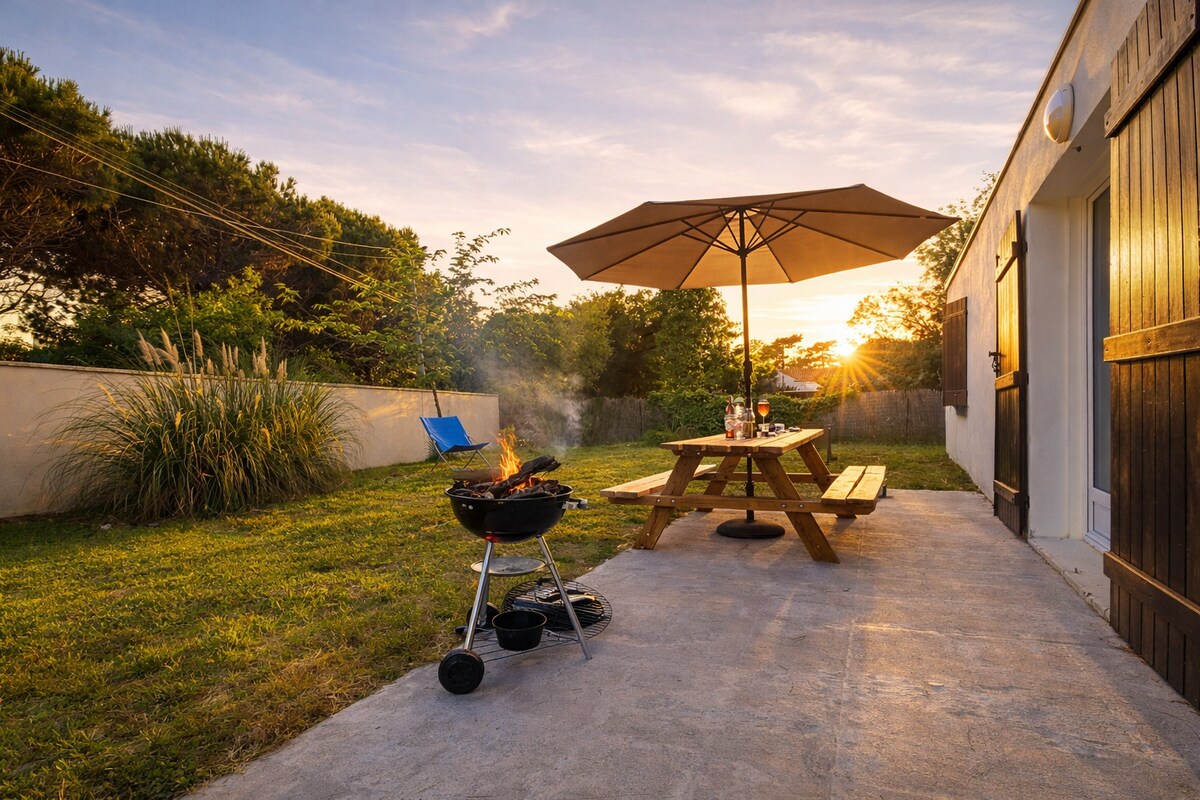 Ubicación ideal para unas vacaciones con capacidad para 6 personas. Tranquila en un callejón sin salida, a 300 m de una hermosa playa, casa reciente de una sola planta en un terreno cerrado de 550 m². Muy cerca de la playa y el bosque, entorno boscoso. Dejamos bicicletas disponibles. 2 terrazas con muebles de jardín, 2 barbacoas de gas y carbón, cocina equipada, 3 dormitorios, camas dobles 140/190, 1 cuna , 1 cuarto de baño, WC separado . Comercios y mercado a menos de 3 km. La casa está equipada con fibra.