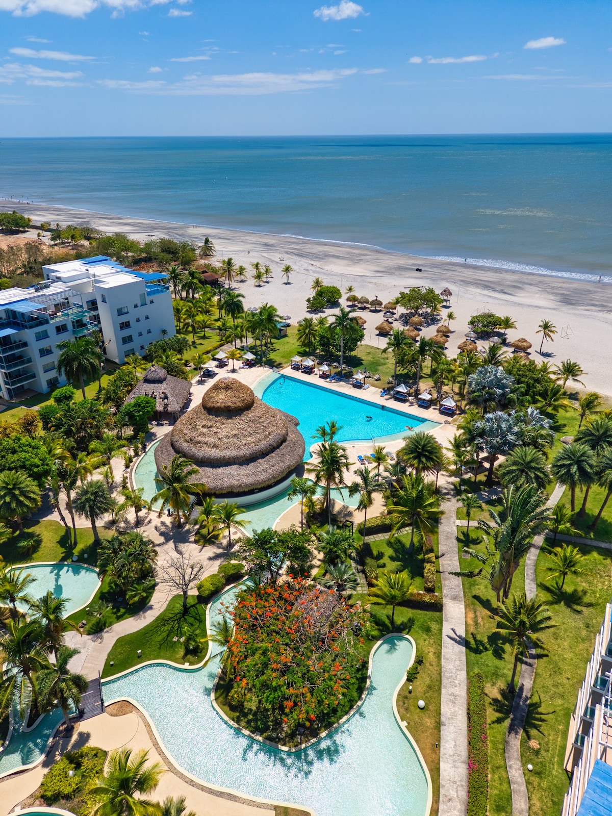 ESPECTACULAR apartamento de lujo FULL EQUIPADO con 3 recamaras (todas con vista directa al mar), 2 baños completos y medio baño de visita; cuarto y baño de servicio. Finos acabados, cocina 100% de acero inoxidable y aires acondicionados en todo el apartamento de alta eficiencia. Condominio con concepto "Hotel Style Living"; Restaurante y Bar para las noches (de Jueves a Domingo), snack bar en el area de la piscina y un Tiki Bar en la playa, ademas de cancha de Volleyball , Tenis, basketball.