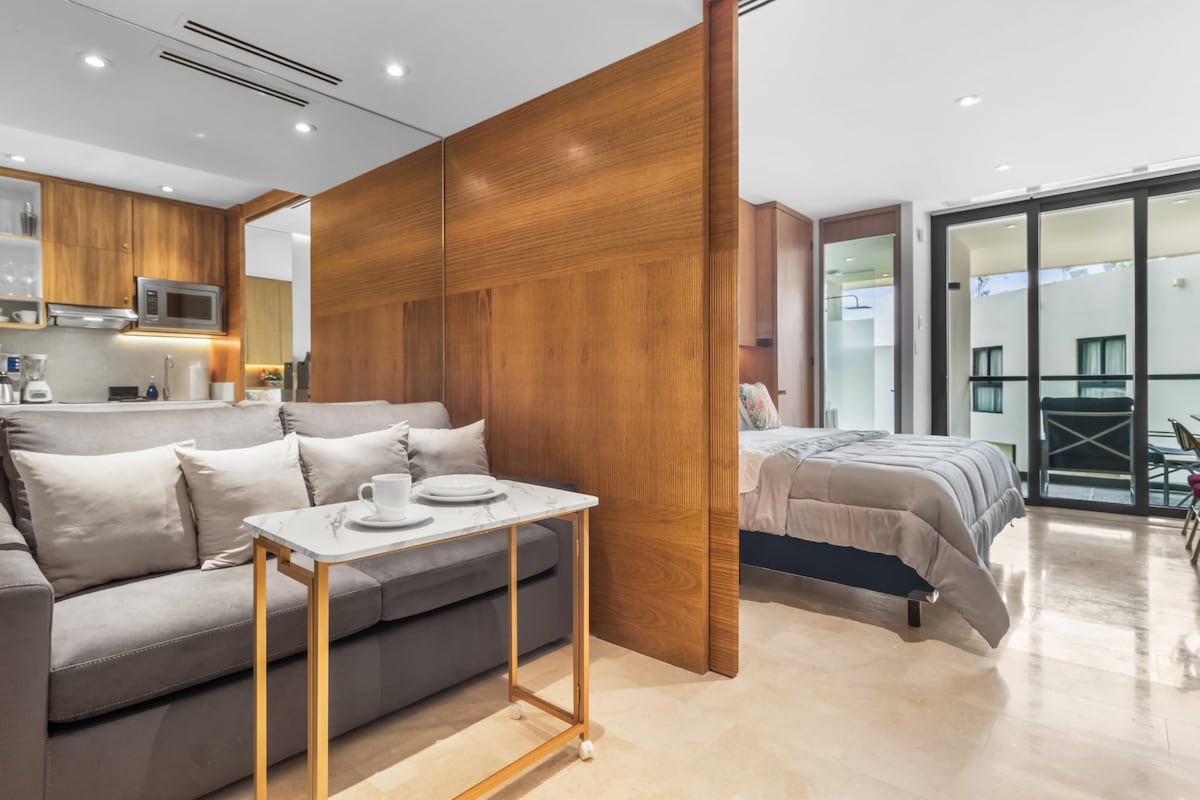 Relájese y Disfrute en nuestro estudio de Lujo para 3 personas cómodamente, cama King size con puerta corrediza para mayor privacidad, dos camas individuales en literas y dos baños completos, la cocina totalmente equipada con lo necesario para una estadía cómoda, disfruta de las vistas al mar y a la marina de la Cruz tomando un vino o un café. La TV es inteligente con servicio de Roku incluido, WiFi de alta velocidad, ventiladores de techo y aire acondicionado central.