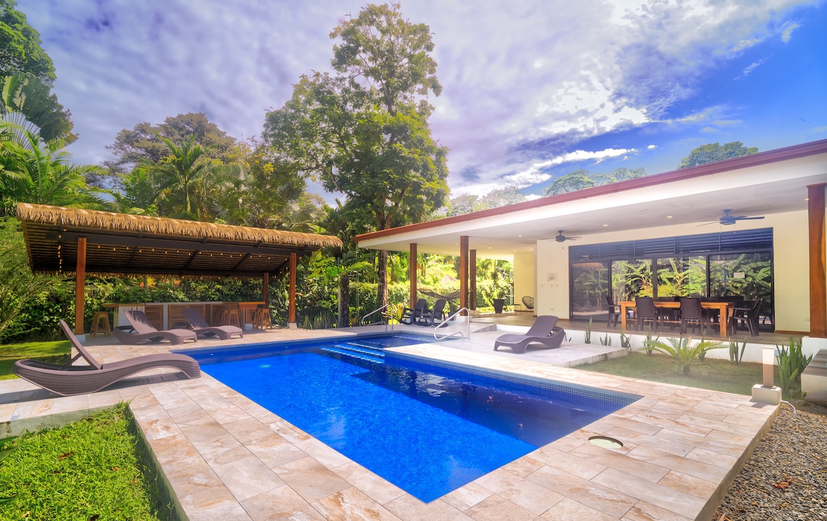 Your tropical jungle stay on the edge of Cahuita National Park awaits. Watch toucans, sloths and Howler monkeys play in the grounds from the luxury of our outdoor hot tub. This tastefully decorated, fully air-conditioned home features 3 double ensuite bedrooms, comfortably sleeping 6 guests. Open-plan living area, breakfast bar and fully equipped kitchen, plus washer/drier. Only 500m from one of the most beautiful beaches in Costa Rica and walking distance to Cahuita.