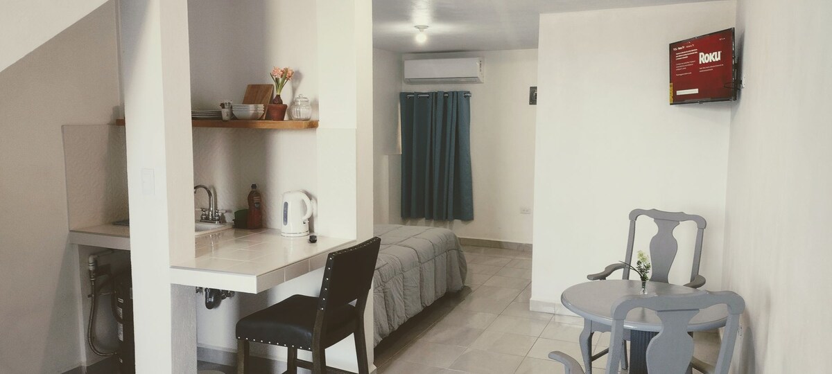 Relájate en esta casa completa ubicada frente al parque de una colonia tranquila. Ideal para dos personas. Cuenta con 1 habitación, 1 cama cómoda, 1.5 baños, sala, cocina equipada y área de trabajo, con aire acondicionado en toda la casa. Estacionamiento privado y techado, con área de asador. ¡Las mascotas son bienvenidas! Tiendas de conveniencia, farmacias y restaurantes se encuentran a menos de 5 minutos. ¡Te esperamos con un espacio limpio, cómodo y en una excelente ubicación!