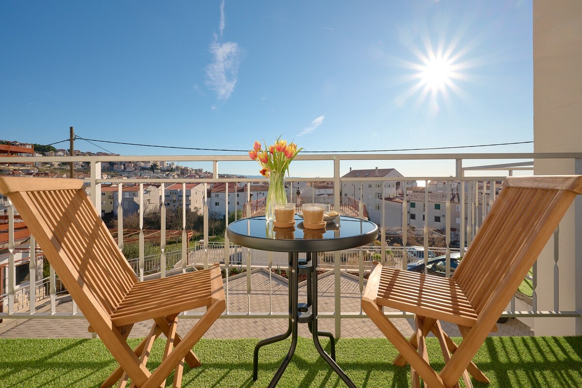 Bienvenido a nuestro moderno apartamento con perfectas vistas al mar. El apartamento consta de 3 dormitorios, 3 AIRES ACONDICIONADOS, 2 baños, sala de estar con cocina y comedor con sofá cama. Tu alojamiento incluye jardín con jacuzzi y parque infantil, terraza con parrilla y plaza de aparcamiento reservada solo para ti. Estamos situados en Podstrana, detrás del popular hotel-resort Le Meridian Lav, a 4 minutos (150 m) de la playa (atajo sin cruzar la carretera solo con escaleras). Es un apartamento para 7 personas.