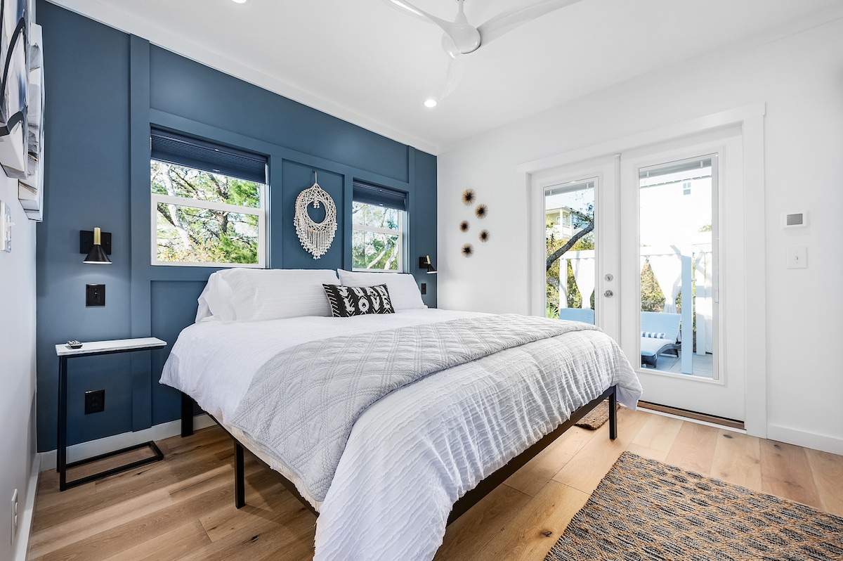 Moderno apartamento tipo estudio sobre garaje con entrada privada y patio. ¡A 1,5 manzanas de las playas de South Walton! Disfruta de una gran sala de estar/comedor y un espacio para dormir separado con cama tamaño king. El sofá también se convierte en una cama tamaño queen. Cocina independiente con nevera, placa y microondas. Dos televisores de pantalla plana con wifi privado, Live Stream, Netflix y HBO. Disfruta de la playa pública más nueva de 30A, a pocos pasos, justo al final de nuestra calle.