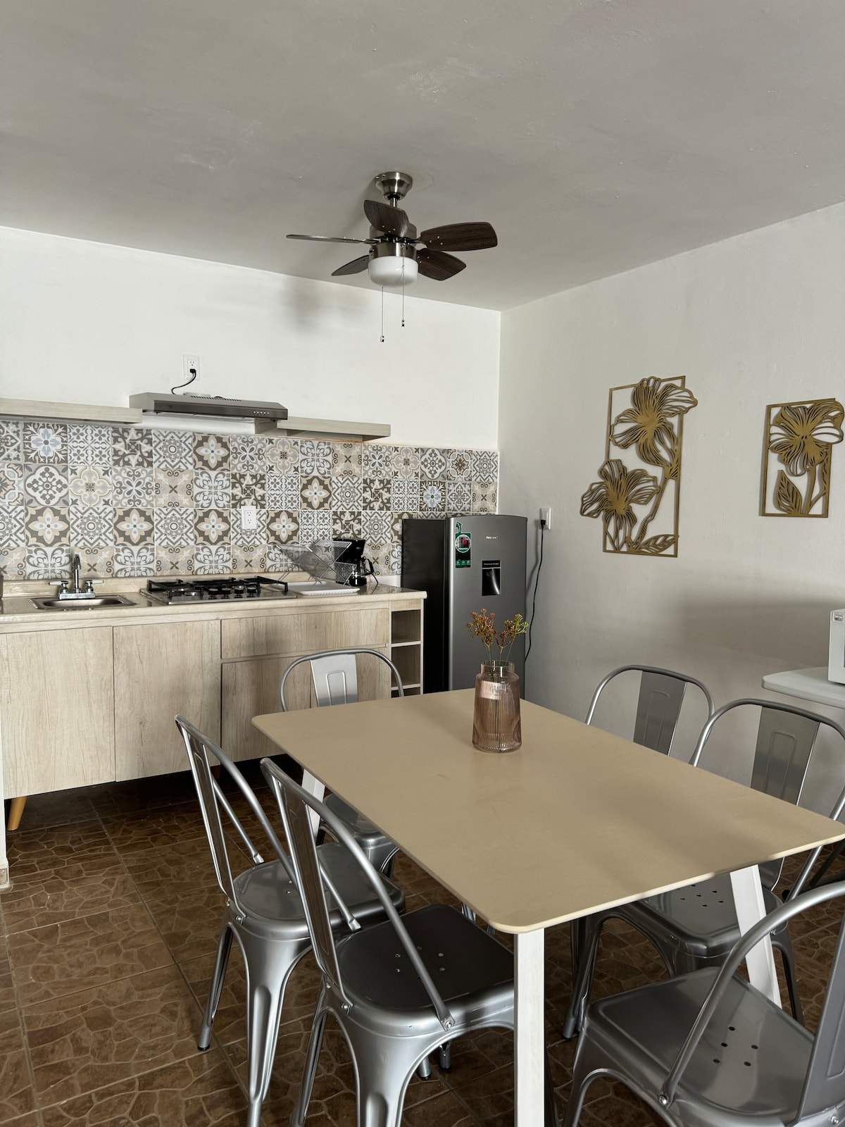 Nuestro diseñador se ha inspirado y preparado para ustedes un lugar con estilo nórdico, limpio y acogedor que hará de su estancia un placentero momento. Una cama king size, 2 camas indviduales, 2 camas bajeras y baño completo. En la cocina encontrarás parrilla de inducción, cafetera, tostador, microondas, refrigerador y cafetera gurmet. Siempre tendrás disponible bodygel, shampo, agua de garrafón.