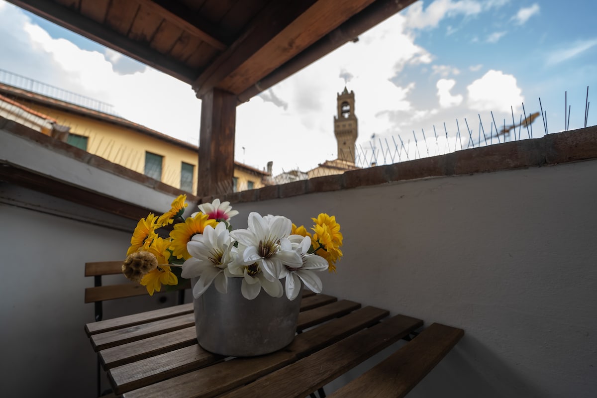 Bienvenido a nuestro encantador apartamento, ubicado en el corazón de Florencia, en Piazza della Signoria. El apartamento cuenta con un dormitorio espacioso con baño privado, una encantadora cocina pequeña y una gran sala de estar. El espacio habitable es acogedor y luminoso, con vistas a la plaza. El departamento también incluye un segundo baño con ducha. Para llegar al ascensor, debes subir 20 escalones.