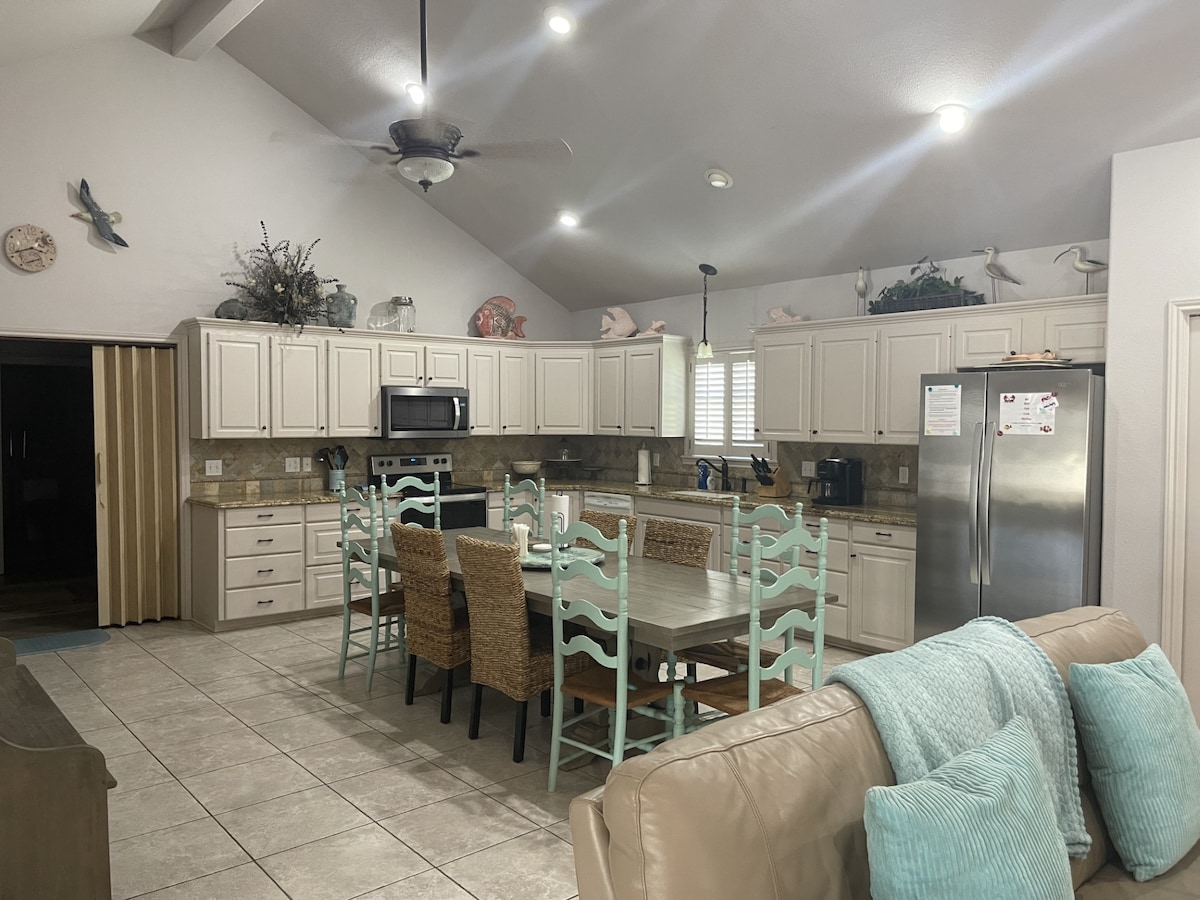 ¡3/4 acres en Keller Bay! ¡Muelle de pesca privado iluminado con luces verdes y hermosas vistas al atardecer! ¡Escapada privada lo suficientemente grande para toda la familia! La casa tiene wifi y aplicaciones de televisión para ver el juego o ver una película. ¡Excelente pesca, excelente caza de patos! Casa recién remodelada con todos los arreglos. Garaje para guardar todo el equipo durante tu alojamiento. Lavadora/Secadora, a minutos del lanzamiento del barco y del parque público. A 10-15 minutos del puerto de Lavaca. Por lo general, 3'-4' de profundidad al final del muelle durante todo el año. (Clima pendiente)