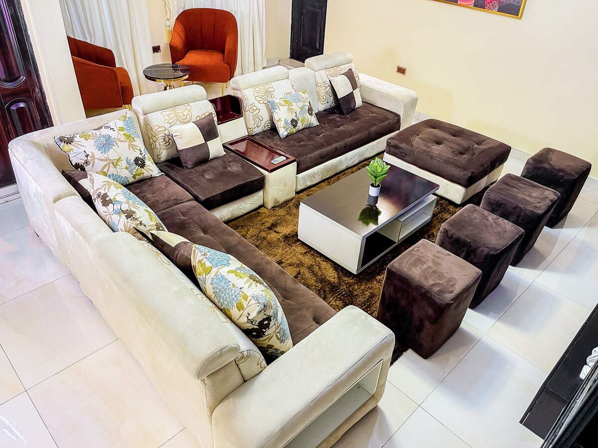 Disfruta de una experiencia elegante en este apartamento céntrico. Este apartamento de 2 dormitorios tiene un colchón doble tamaño king en el dormitorio principal y un colchón tamaño king en la otra habitación. También tiene comodidades como aire acondicionado, televisión inteligente. Las habitaciones son generosamente amplias, con un espacio de estudio/oficina. La cocina está totalmente equipada. Fuente de alimentación 24/7 (sistema inversor disponible). Este alojamiento es apto para familias.
