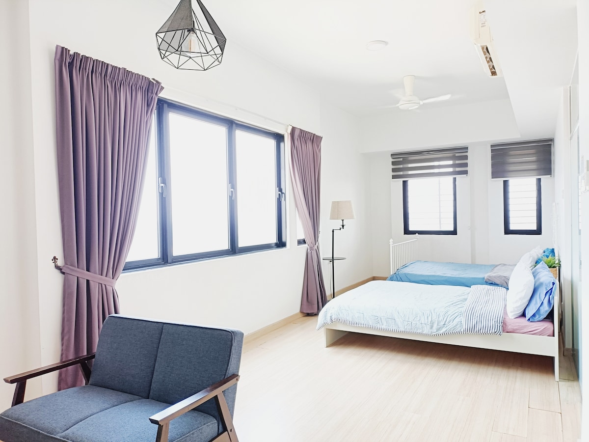 A Modern-style 2-bedroom, 2-bathroom apartment with a balcony, equipped with two double beds. Suitable for 2 to 4 guests. Each bathroom provides hot and cold water for a relaxing shower experience. Facilities include: Body wash, shampoo, hand wash. Refrigerator, kettle, rice cooker LED TV, TV box, hairdryer, iron, and ironing board Free high-speed Wi-Fi (100 Mbps) 1 parking spaces