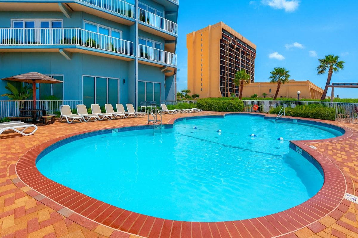 ★Beachfront with UNOBSRUCTED Ocean Views! ★Fast Wifi, keyless entry cable TV Netflix ★5 Star cleaning disinfecting sanitation! ★Corner Unit with wrap around balcony ★Plenty of shops/restaurants walking distance. ★Heated Pool, Hot Tub sundeck elevator ★Beach chairs, beach towels, body boards, beach toys provided - FREE ★Watch the fireworks from your private balcony ★Plenty of lounges on balcony ★Fully equipped kitchen w/everything you'll need. ★Video arcade board games ★Steps from the beach!