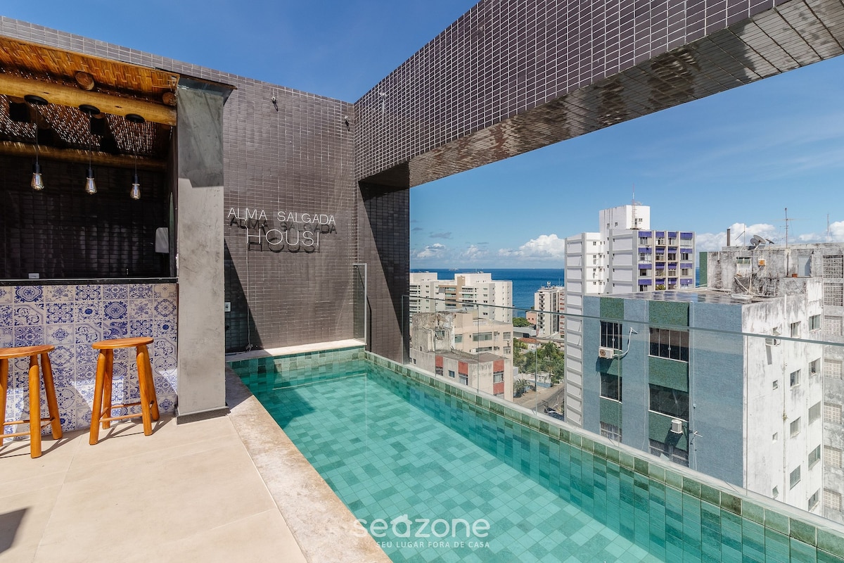 Moderno apartamento con dos baños en suite, impresionantes vistas al mar en todas las habitaciones, televisor inteligente de 55 pulgadas, 500 MB de Wi-Fi, aire acondicionado en la sala de estar y dos dormitorios, piscina, gimnasio, dos plazas de estacionamiento y recepción las 24 horas. ¡Situado a solo 30 metros de la playa, en el circuito de Carnaval, y a 100 metros de Farol da Barra!