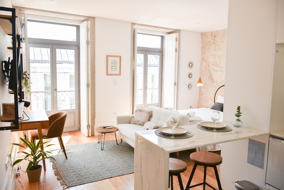 Our studio, located in the heart of downtown Porto, is a charming retreat for your stay. Within walking distance of São Bento Station and the iconic Clérigos Tower, you'll be immersed in the history and culture of the city. This recently renovated historic building offers a breathtaking view of the city from your balcony. The studio features a fully equipped kitchen and a Smart TV for your entertainment, along with the convenience of an elevator, ensuring a comfortable stay.
