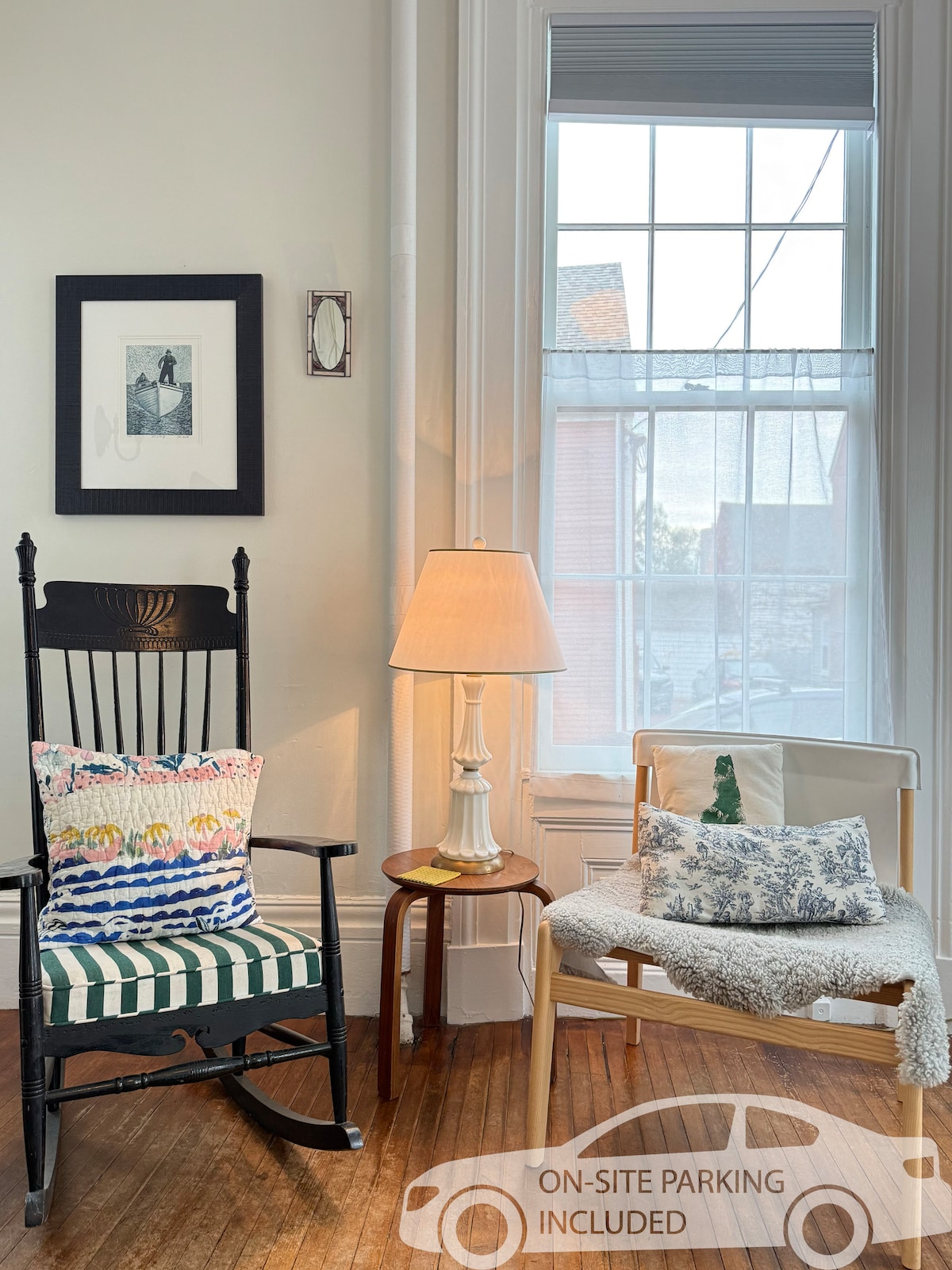 Estudio privado soleado en una casa adosada histórica de 175 años, con entrada privada, cocina pequeña y ESTACIONAMIENTO INCLUIDO en el corazón del distrito histórico del centro de la ciudad. Perfecto para una escapada en pareja, una semana y una estadía de trabajo o para familias locales. Llena de luz, arte y muebles eclécticos. A una cuadra de Market Square, en medio de restaurantes y tiendas. A 2 cuadras de Prescott Park, Strawbery Banke, Portsmouth Harbor y parques públicos. * Sitio de la casa de Daniel Webster.