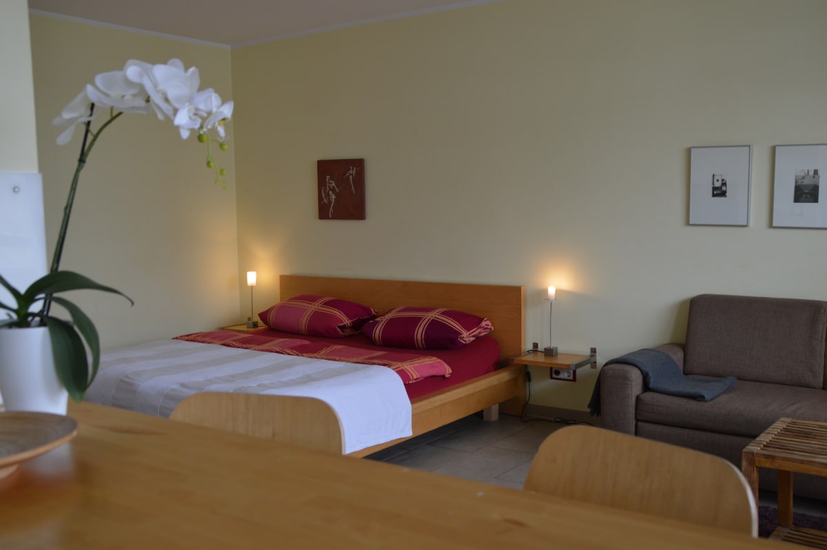 Apartamento cálido y tranquilo de 40 metros cuadrados con entrada privada en una casa adosada de estilo Bauhaus. 🌡️ La calefacción por suelo radiante llena el espacio de una suave calidez. La suave luz del día de la ventana corrediza de 4 m establece un ambiente tranquilo. Sal a la acogedora terraza para tu primer café de la mañana, sintiendo el aire fresco y el tranquilo jardín a tu alrededor. Perfecto para mañanas lentas y noches acogedoras. ⚡ Wifi muy rápido · 👥 2 huéspedes · 🍳 Cocina totalmente equipada · 🧺 Lavadora