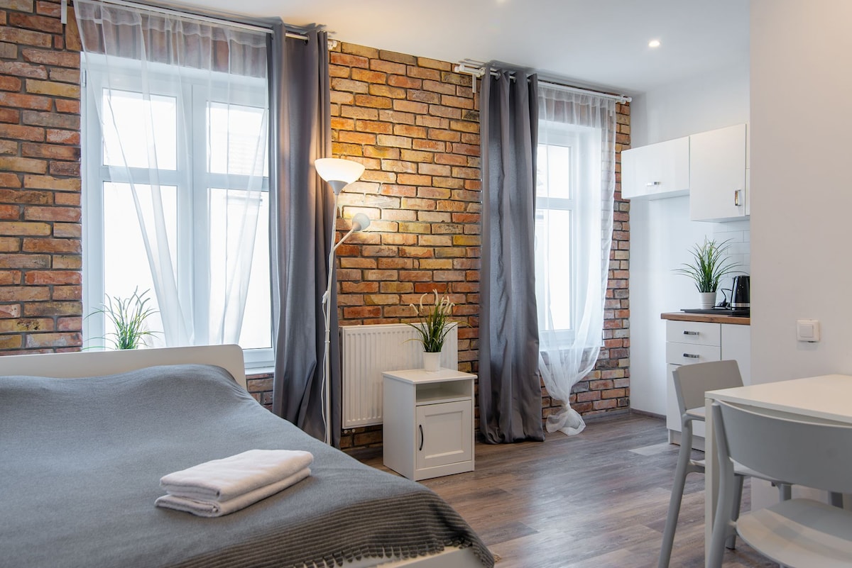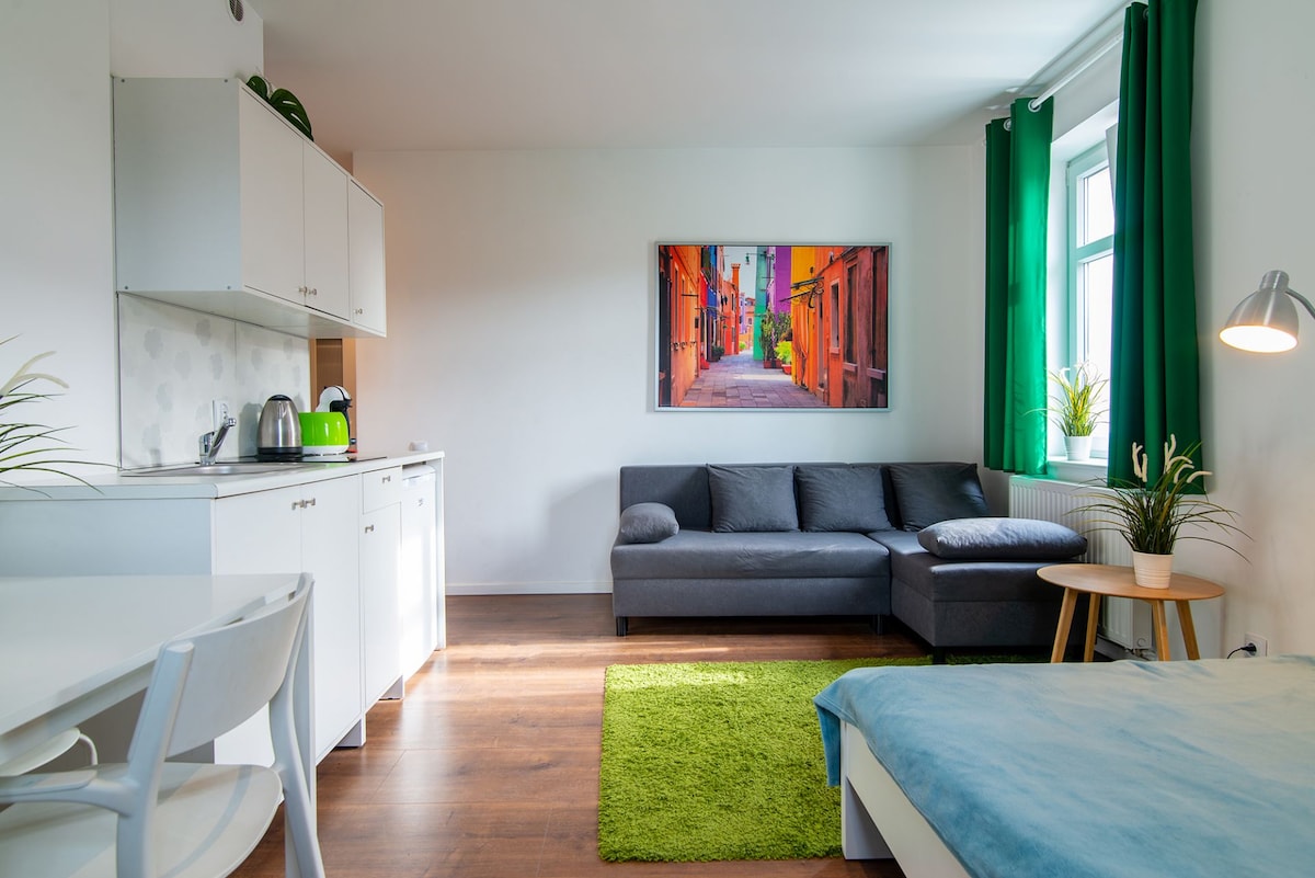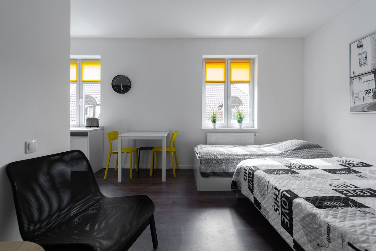 La propiedad ofrece apartamentos estudio dobles totalmente equipados, cómodos y modernos, cada uno de los cuales está amueblado con estilo, un espacio con cocina pequeña, un cómodo baño y un dormitorio. Los huéspedes pueden utilizar TV por cable, Internet de alta velocidad y sábanas y artículos de tocador de hotel de alta calidad. Los interiores cuidadosamente diseñados se distinguen por la atención al detalle, la ergonomía y la funcionalidad, lo que hace que todos se sientan como en casa.