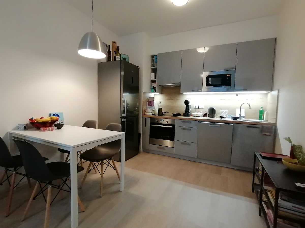 Un cómodo estudio con una cocina totalmente equipada, que incluye todos los utensilios de cocina necesarios para cocinar. La cocina está equipada con 2 placas de inducción, horno microondas, refrigerador pequeño, cafetera y hervidor de agua. Hay una lavadora y una secadora de pelo en el baño. El apartamento también está equipado con una caja fuerte para la seguridad de los documentos y objetos de valor de nuestros huéspedes, una secadora de ropa, una plancha, una tabla de planchar y un televisor. El departamento puede alojar hasta 2 huéspedes (cama completa 160x200).