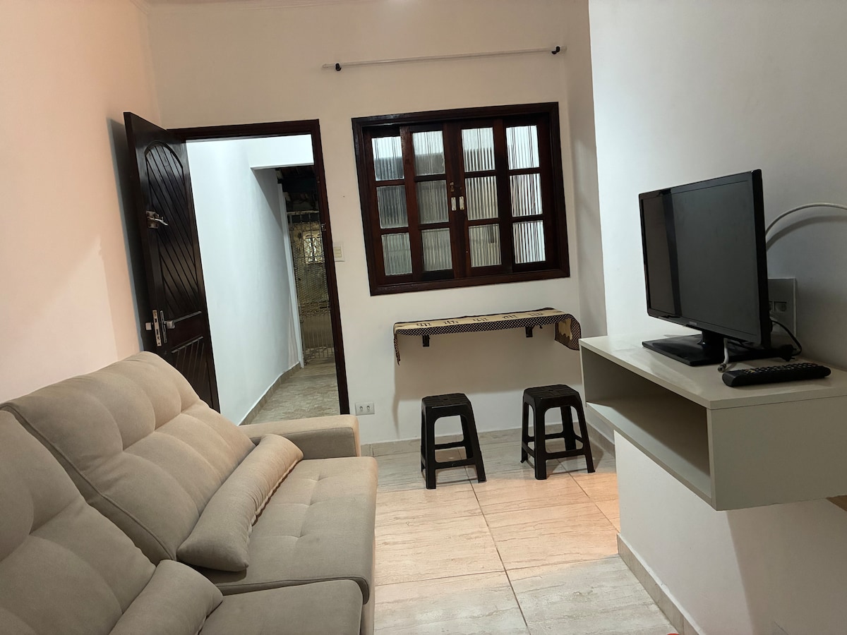 Casa en Praia Grande - Vila Tupi cómoda, con garaje privado y privado. Ambiente con Wi-Fi, parrilla, hamaca, sofá, estante y TV, aire acondicionado en la sala de estar y el dormitorio Dormitorio, 1 cama doble, 2 literas y 1 sofá cama en la sala de estar. Baño con ducha eléctrica y espejo. Cocina totalmente equipada con nevera, estufa, horno, gabinete y utensilios domésticos. Cerca de supermercados, panadería, gasolinera y comercio general. Tu mascota es más que bienvenida.