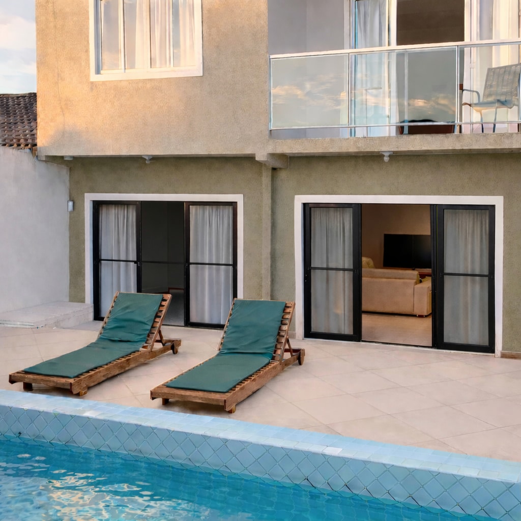 Casa Beira Mar con piscina, vista al mar desde todos los ambientes, 3 dormitorios, uno de ellos en suite, baño social, 2 aseos, cocina con parrilla gourmet, gran mesa de comedor, ático con terraza, amplio patio. Para quienes buscan descanso, ocio y contacto con la naturaleza.
