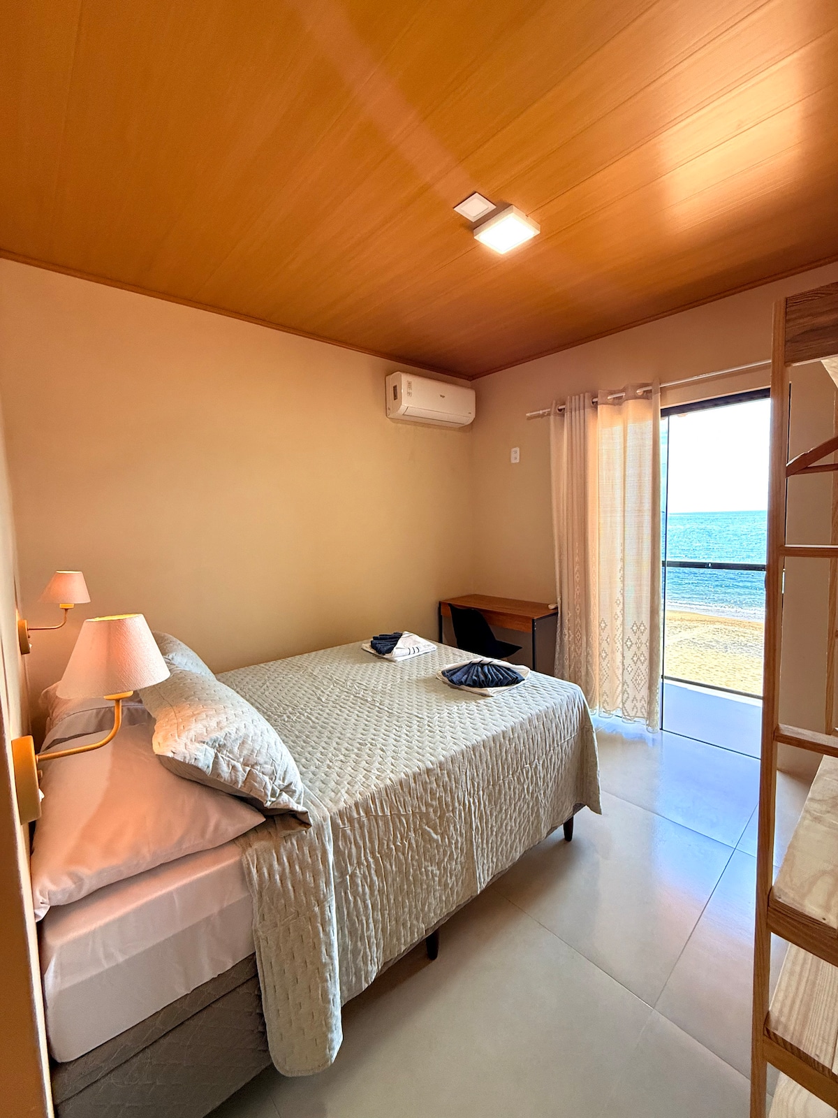 Abrace a simplicidade neste lugar tranquilo e bem-localizado. Suíte ideal para casal, com vista pro mar, cozinha em anexo e a 3 minutos subindo da Praia do Aventureiro.