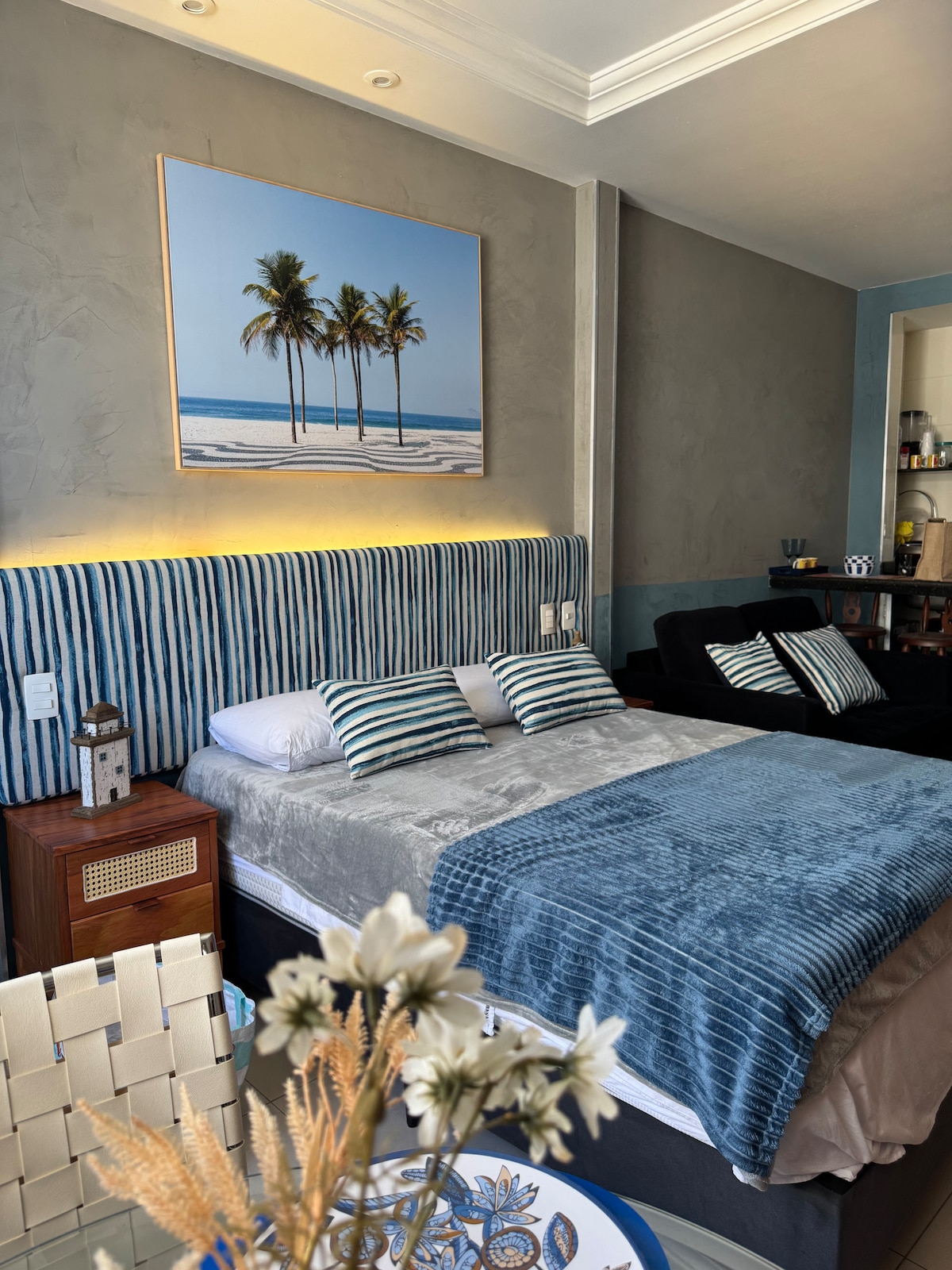 Sinta a bossa nova com a brisa do mar na CASA JOBIM, e curta toda a experiência e conforto de estar em um apartamento concept design em Copacabana, onde a inspiração se encontra com a beleza do Rio de Janeiro. Estamos localizados no Real Residence Hotel que oferece todo conforto para uma estada elegante e prazerosa. Oferecemos camareira, Wi-Fi de 500 MB, tv a cabo, Netflix e ar condicionado e espaço de coworking a três quadras da praia. Opção de duas camas de solteiro ou uma cama queen.