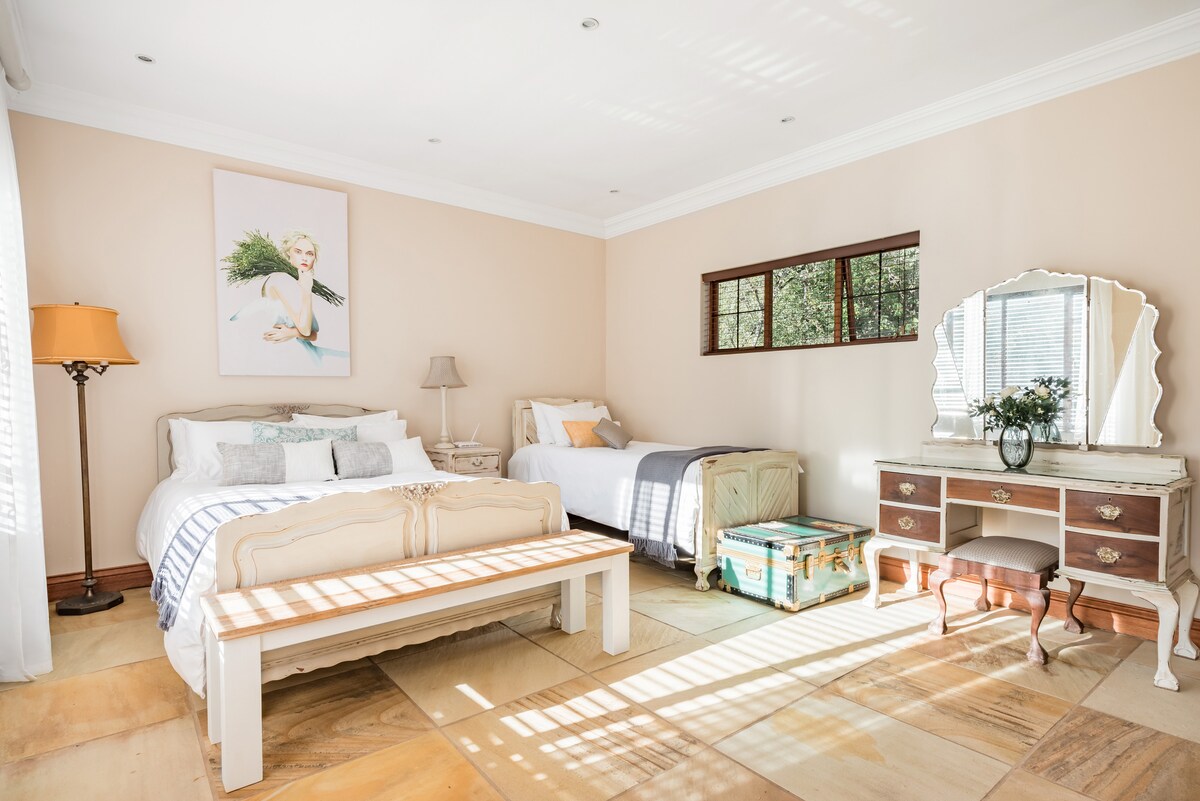 La suite ejecutiva Wild Olive es ideal para los viajeros más exigentes que buscan espacio y lujo. Situado en un barrio seguro en el frondoso suburbio de Craighall, Wild Olive ofrece una ubicación céntrica y cómoda cerca de Sandton CBD (3 km), Hydepark, Rosebank y Bryanston. La suite está situada en el primer piso y tiene una entrada privada con aparcamiento seguro fuera de la calle. Internet rápido sin límite y energía ininterrumpida. Ten en cuenta que la suite incluye solo una pequeña cocina, sin fogones.