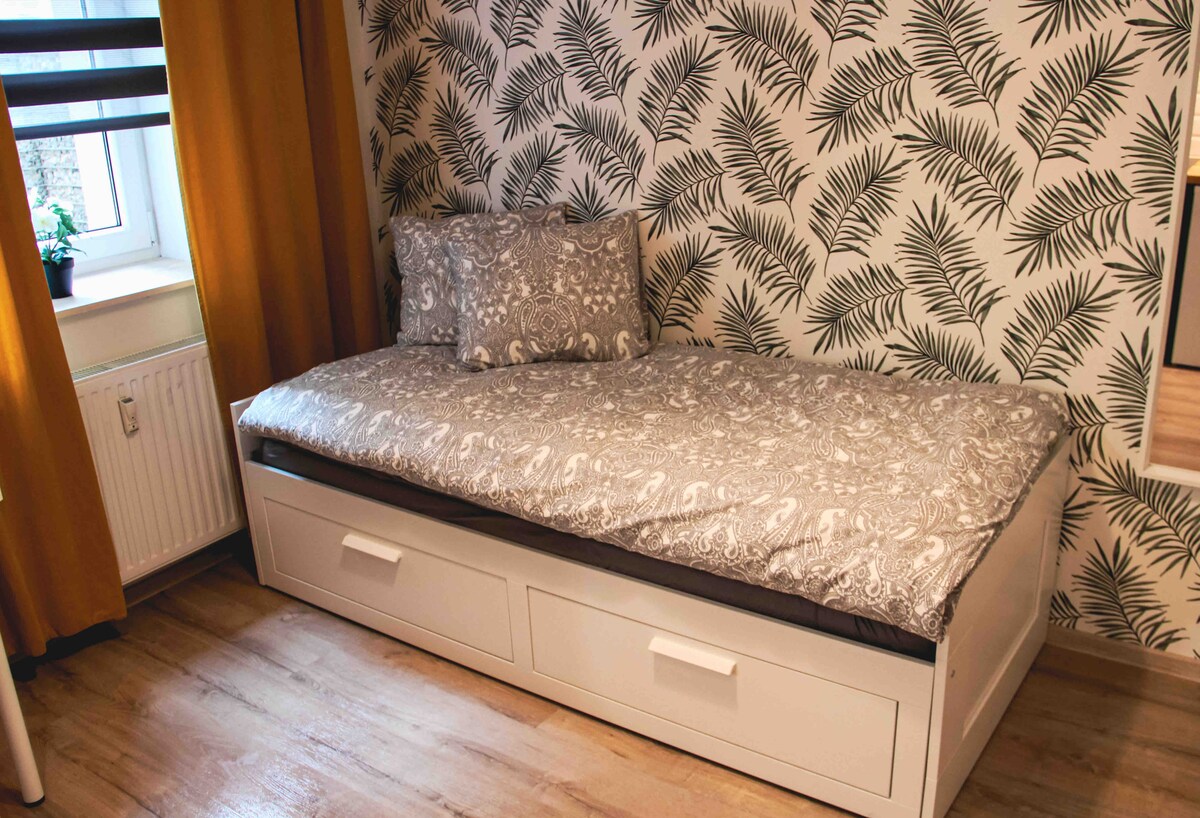 Te invitamos a nuestro acogedor apartamento de 2 dormitorios en una casa de vecinos. Gracias al gran número de ventanas con vistas a la vegetación, las habitaciones están bien iluminadas y dan al patio. El departamento está equipado con lo necesario para una estancia cómoda. Consta de una sala de estar, un dormitorio, un vestidor, un baño con bañera y lavadora; una cocina transitoria. El apartamento se caracteriza por un acceso rápido al centro, Chrobry Park; Pre Zero Arena Hall. Acceso rápido al centro de la ciudad, DTŚ, A1 y A4. Estacionamiento gratuito :)