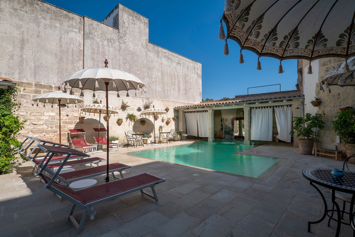 Passeggiando per le vie di un piccolo paesino, Sannicola, nel cuore del Salento, una scalinata di un palazzotto di fine '800 vi condurrà verso una dimora storica: Azalea Suite Deluxe è un’oasi di piacere per la coppia dai tenui colori pastello di giorno che si colora intensamente nelle ore più buie, per un’atmosfera intima e romantica. Vasca idromassaggio in marmo ad uso esclusivo nella suite privata. Seconda piscina a sfioro esterna, condivisa.