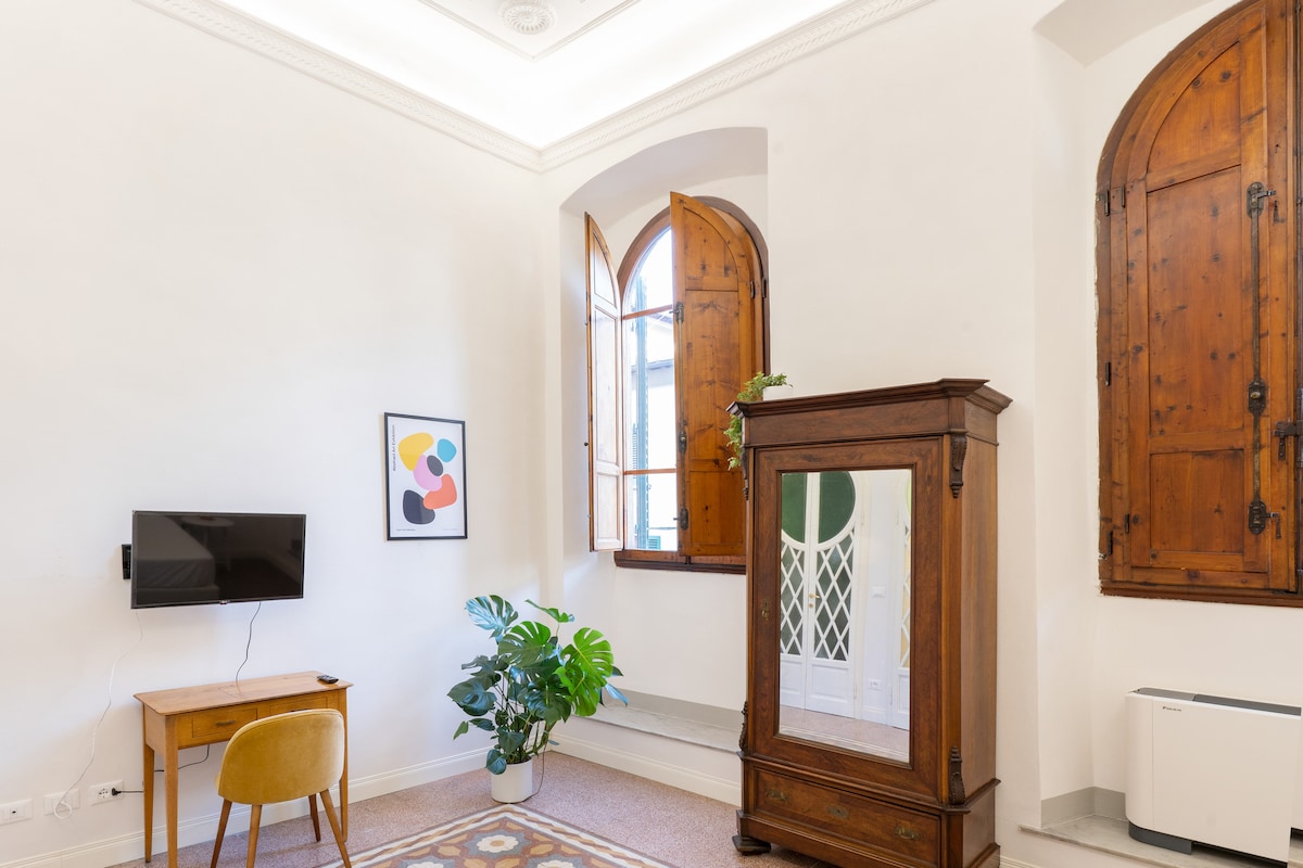 This cozy apartment is the attic of a nineteenth century four-storey building, in the old town of Pistoia. We recently renovated it keeping its traditional and typical details (like the exposed wooden beams and the brick walls). We furnished it mixing antiques and vintage furniture, found in flea markets all over Italy and in our childhood houses. The windows overlook the red roofs of the ancient buildings, the tall trees of the park nearby and the guard tower of the sixteenth century fortress.